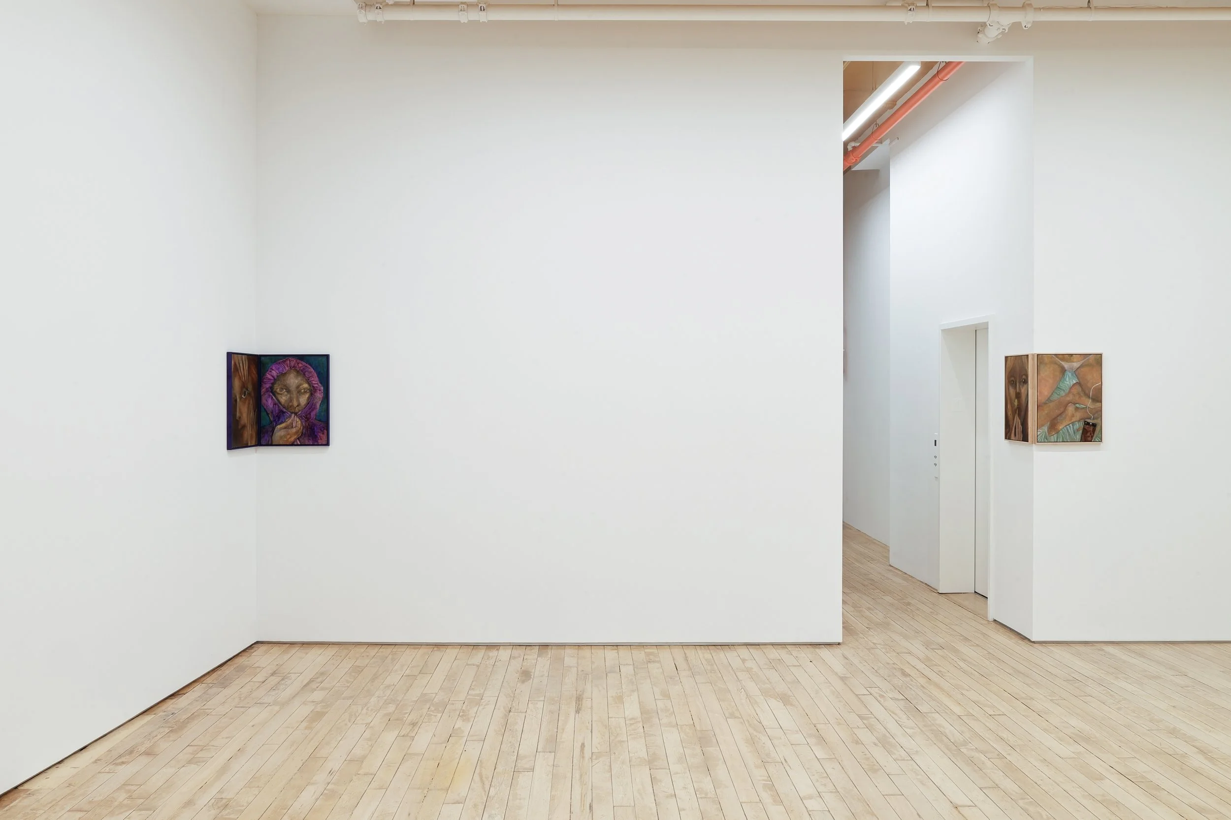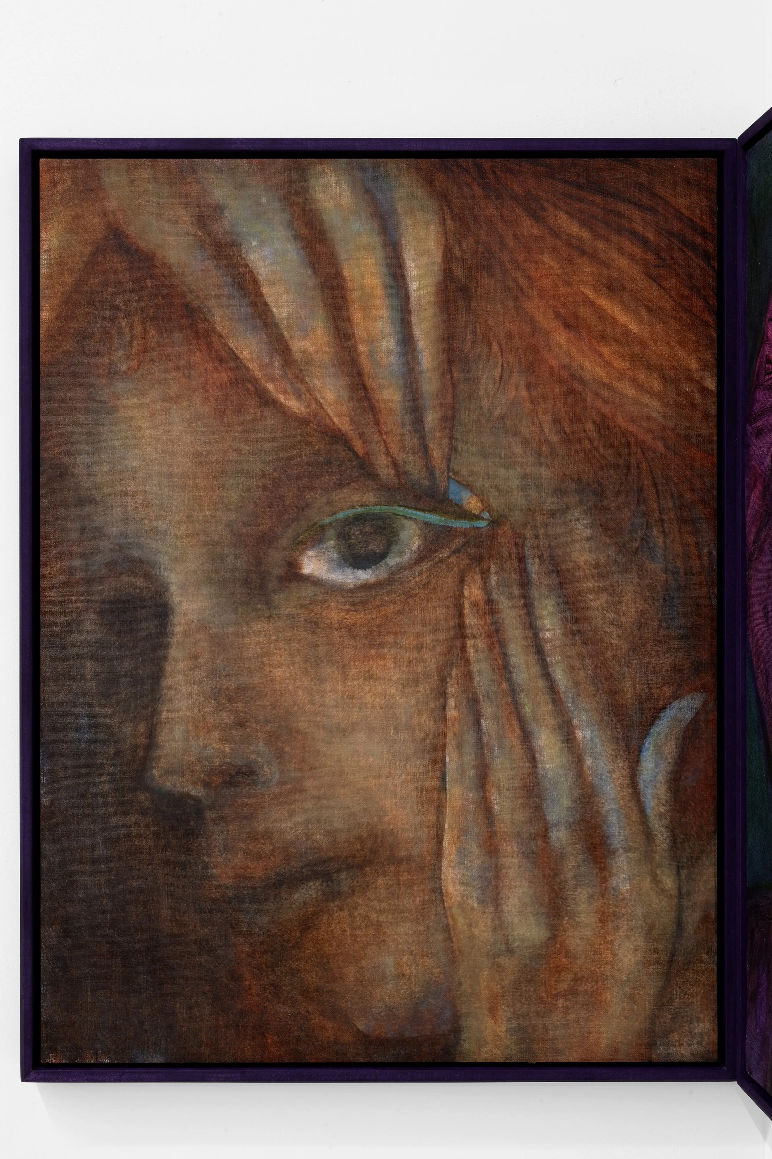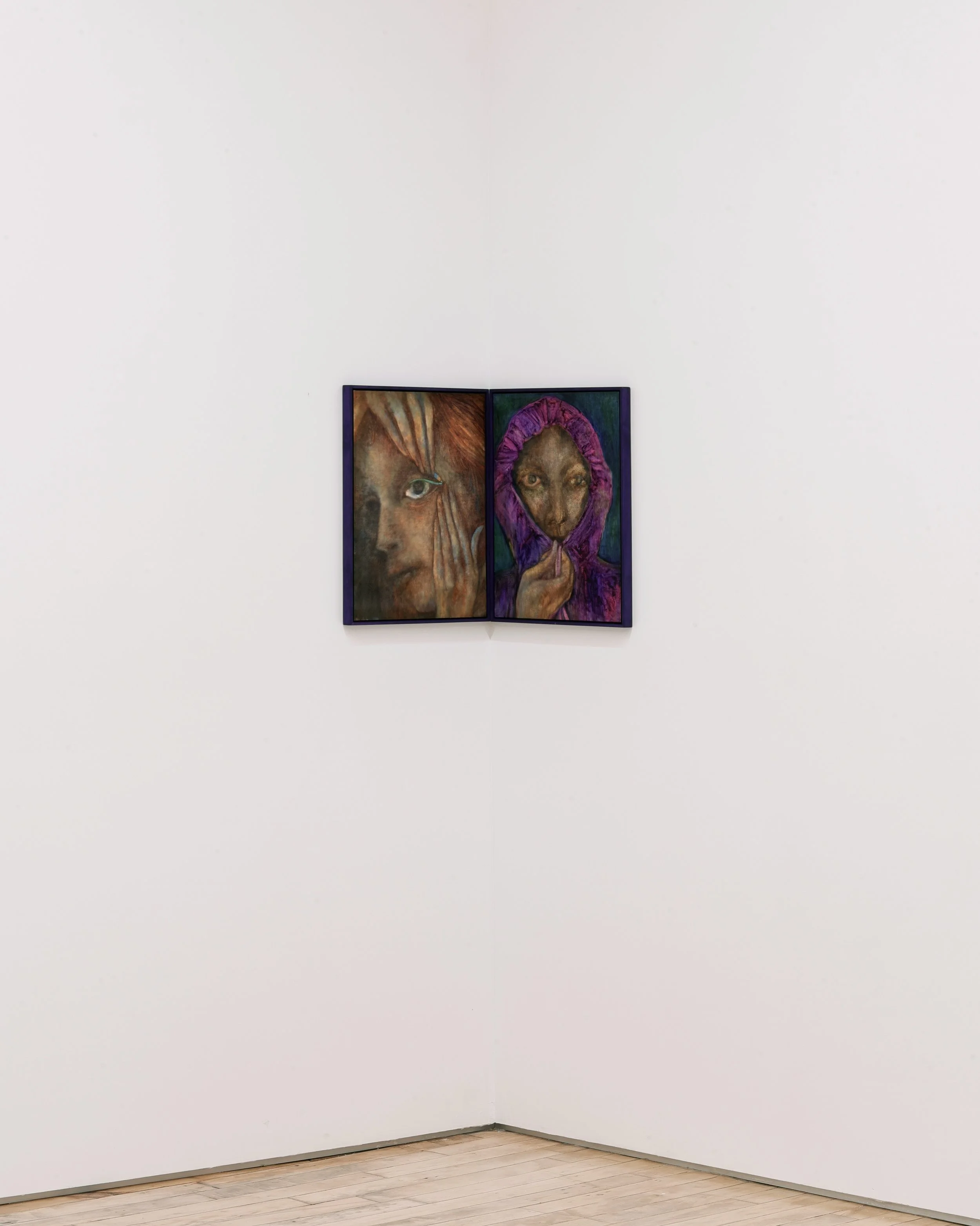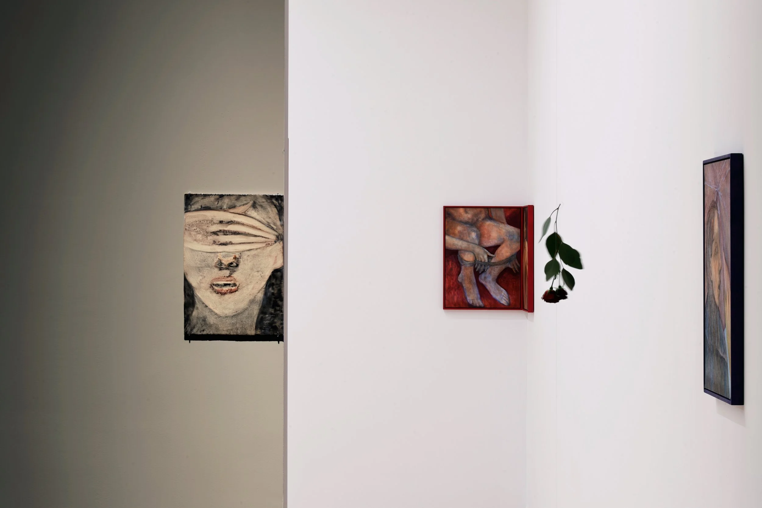 Pregnant with a quiet erotic, oil becomes light and translucent on paper, flesh dimmed and rubbed. In the hands of Rintsch, hair hangs like a dried carving or wet mop. Skin colors like an oxidized fruit or a weathered corpse. Fainted stare yearns in a face smudged. Rintsch banishes the prescribed seduction of female figuration from the masculine tradition of painting and offers a blasphemous self-exploration of imperfections. The space is dark, moist, glistening in uncertain depths and shallow grounds, whispered with caprice, stranded in a blushed ear. Socks and Poppy. Speak with your fear.