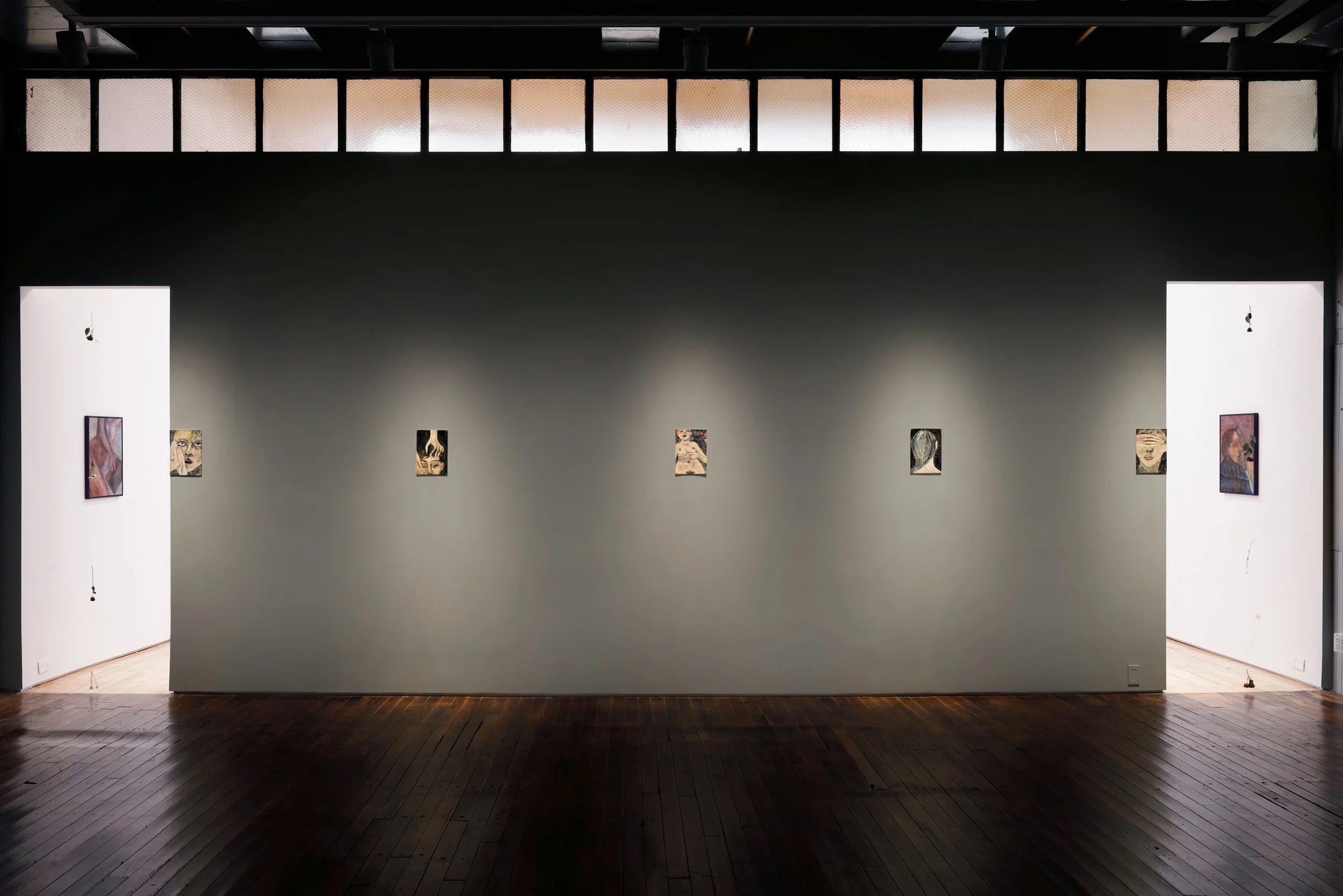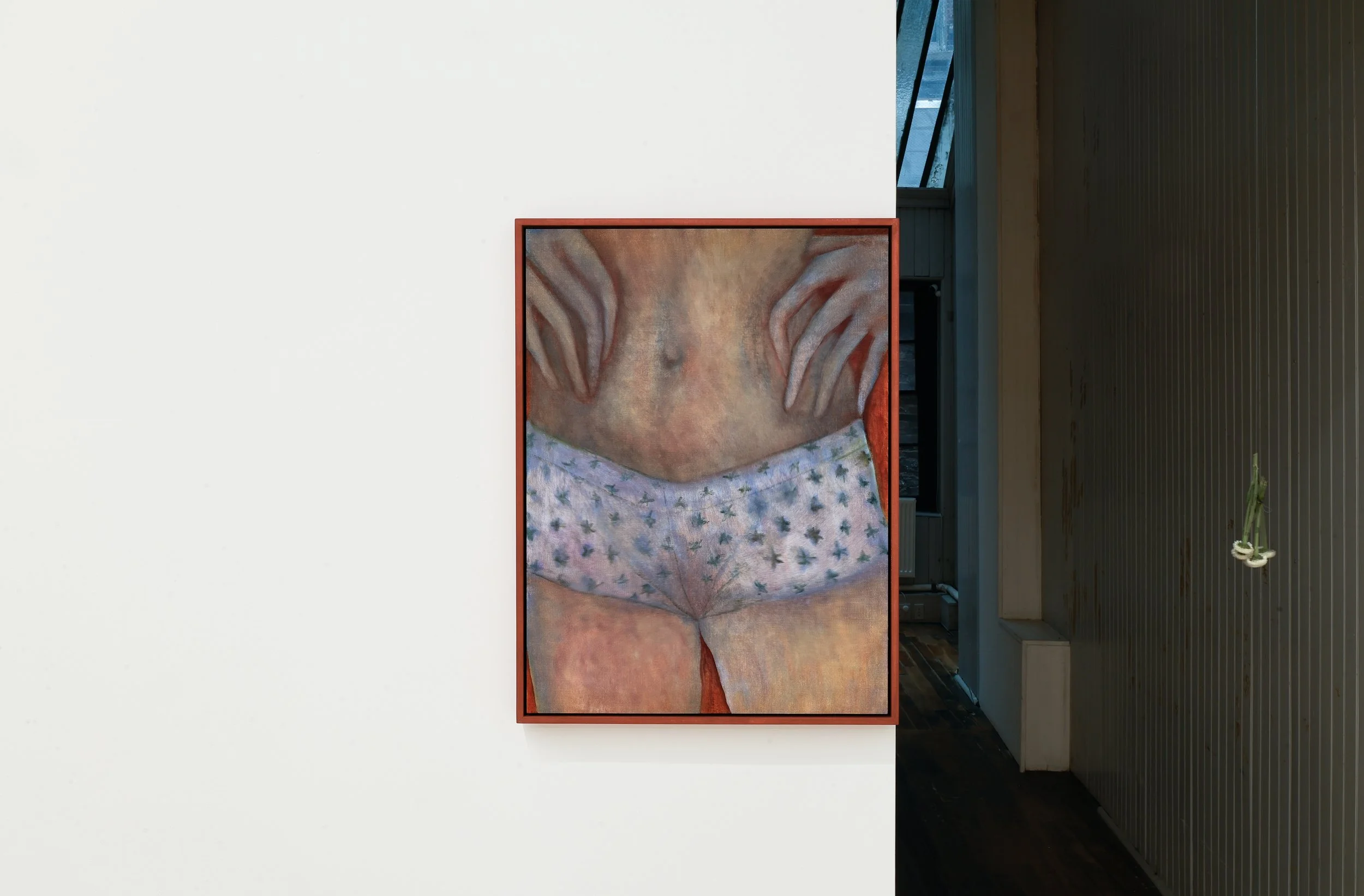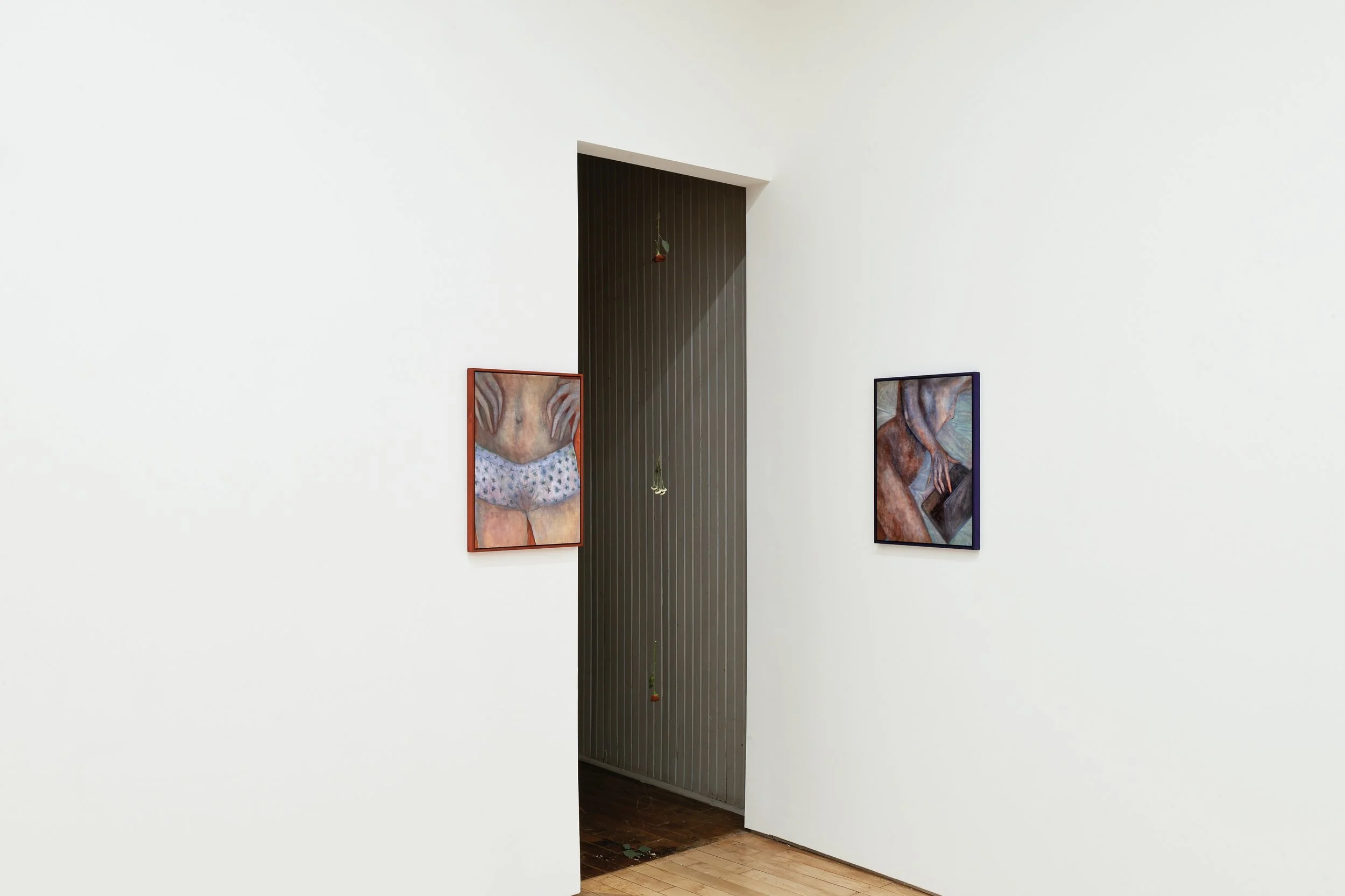 Layers lather in the surfaces of Rintsch’s works—layers obscure, porous, deceiving. Sheerness is embodied as an act of garment, by a simple gesture of going under and stretching open—socks thick, elastic fingers. In the passage of unbecoming to coming into being, everything is strange and new. A monstrous baby born out of a bizarre dream, (un)leashed with a chain of pearls as umbilical cords, coming loose. An orange moth ascends with a thread of umbilical pearls, emerging against green viscous drips. Red curtain. Wonder eyes, legs open, dark skies.