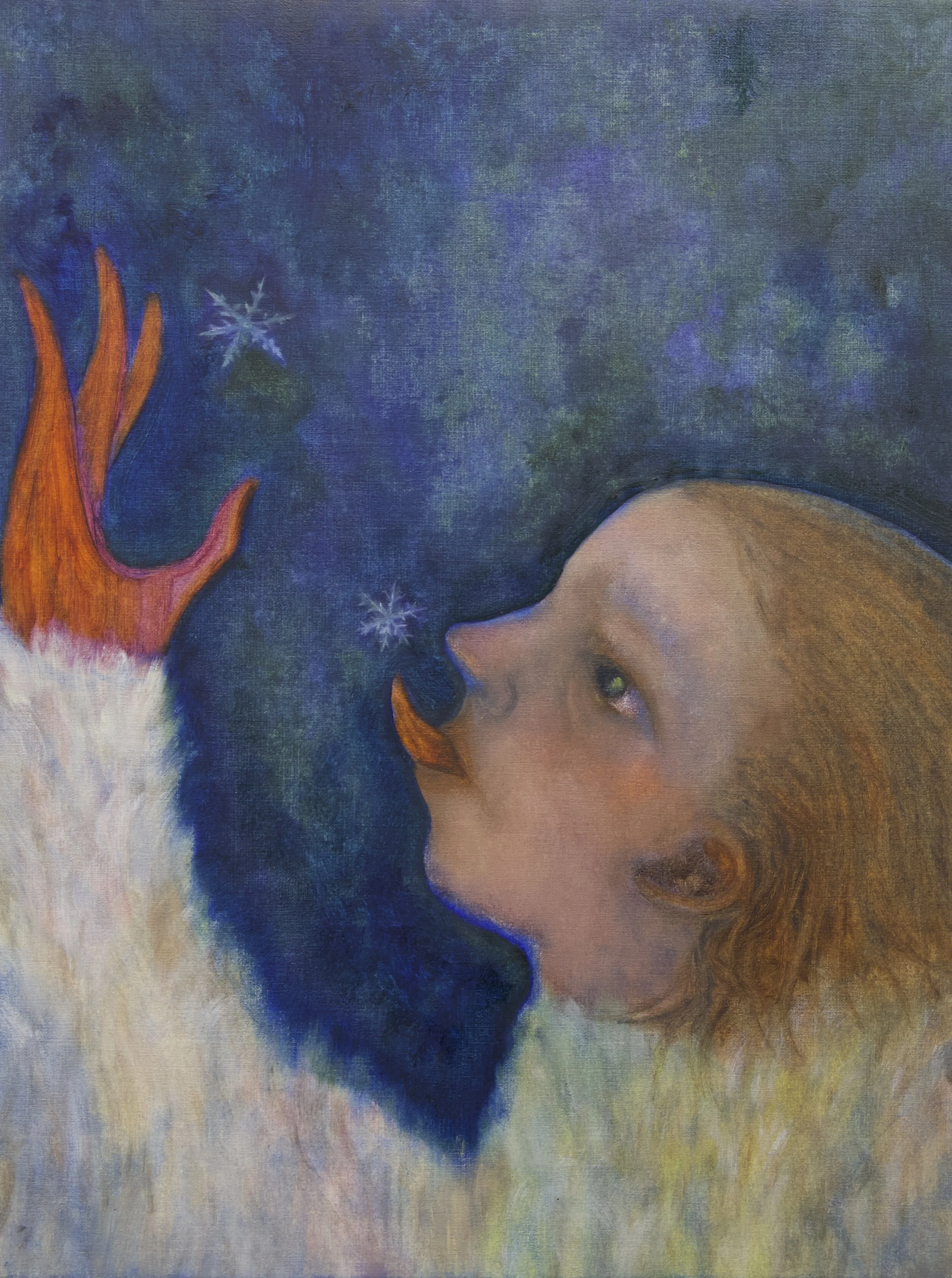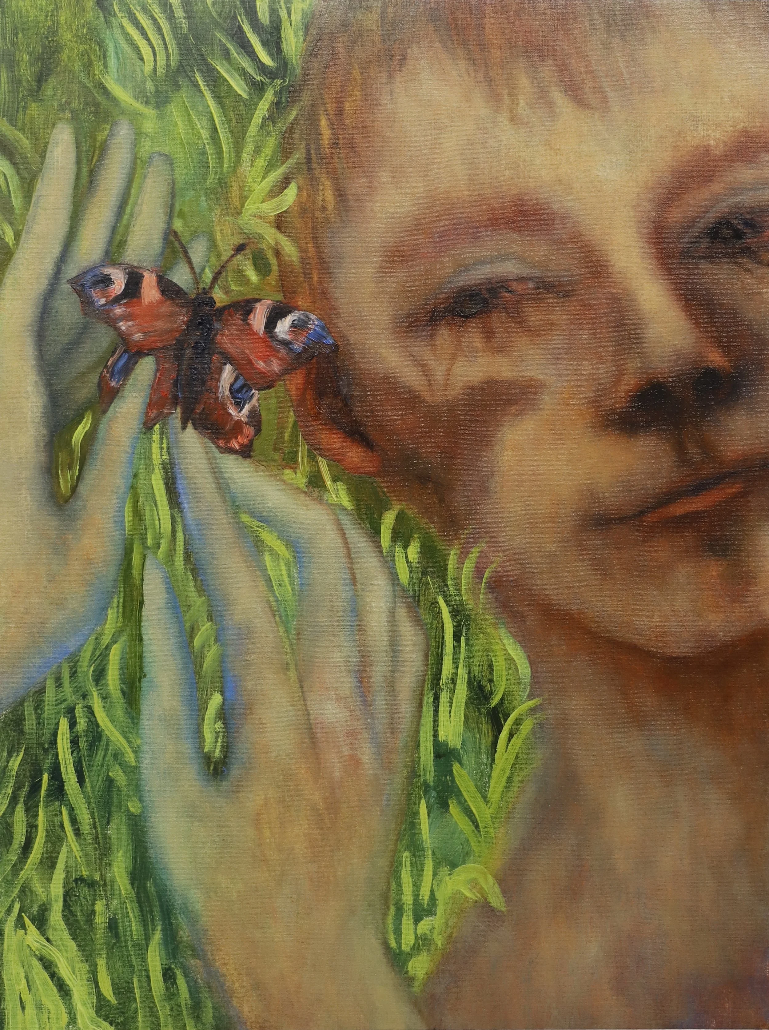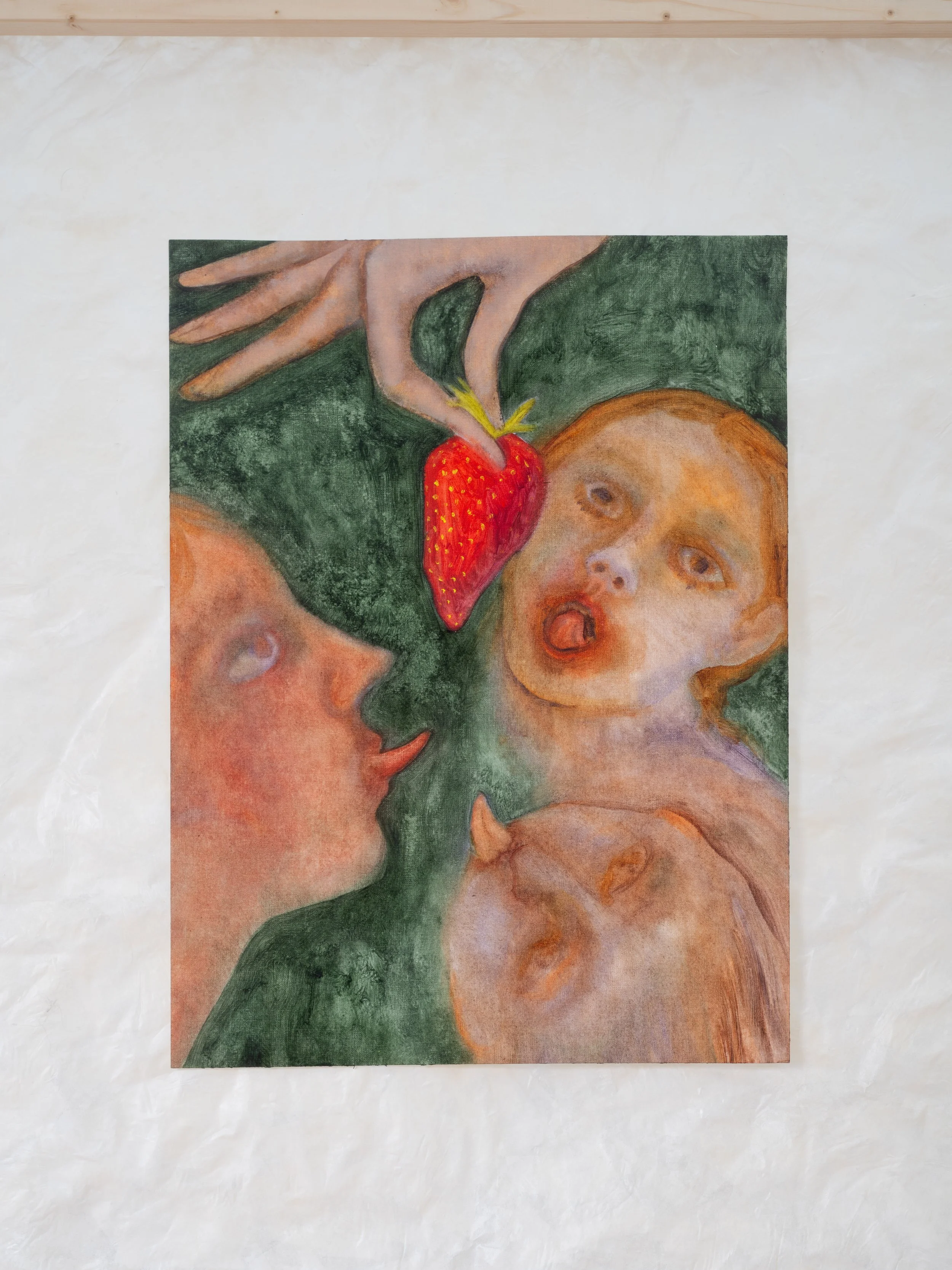 In her first solo exhibition Schmetterlingskuss (Butterfly Kiss) at La Felce in Cologne, the Düsseldorf-based artist Pauline Rintsch (*1995) presents new works. In her figurative paintings, she explores themes of our human existence: everyday scenes and gestures, friendship and motherhood. The artist is driven by the events and scenes that surround her. It is not the solitary genius who creates, but rather her works are based on the exchange between people and thus offer us scope for projection and points of reference for personal experiences. With an open eye and an interest in details, Pauline Rintsch develops her works on the basis of the objects or moments that fascinate her. Her latest small-format works also draw inspiration from the artist’s immediate surroundings, but are now imbued with a poetic, fairytale-like narrative in which humans and animals draw closer together: The cat on a child’s head becomes human hair, a fur coat becomes protective fur and slender hands become red claws. In another instance, three girls greedily stretch their heads and tongues towards a juicy strawberry, resembling young birds. The animal(ism) serves not only as staffage or a symbol, but also awards Pauline Rintsch’s works an anti-rational and magical form.